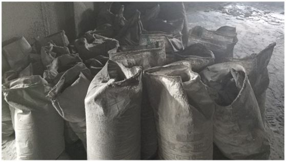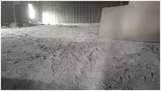 在另一家生产体育用品生产的工厂里,记者看到在该厂3楼,有一间100多平米的空置房间,房内有十几个麻袋内装满黑色粉尘,地上暴露在空气中的粉尘有2、3厘米厚,一名执法人员一进入就粘了一身灰。